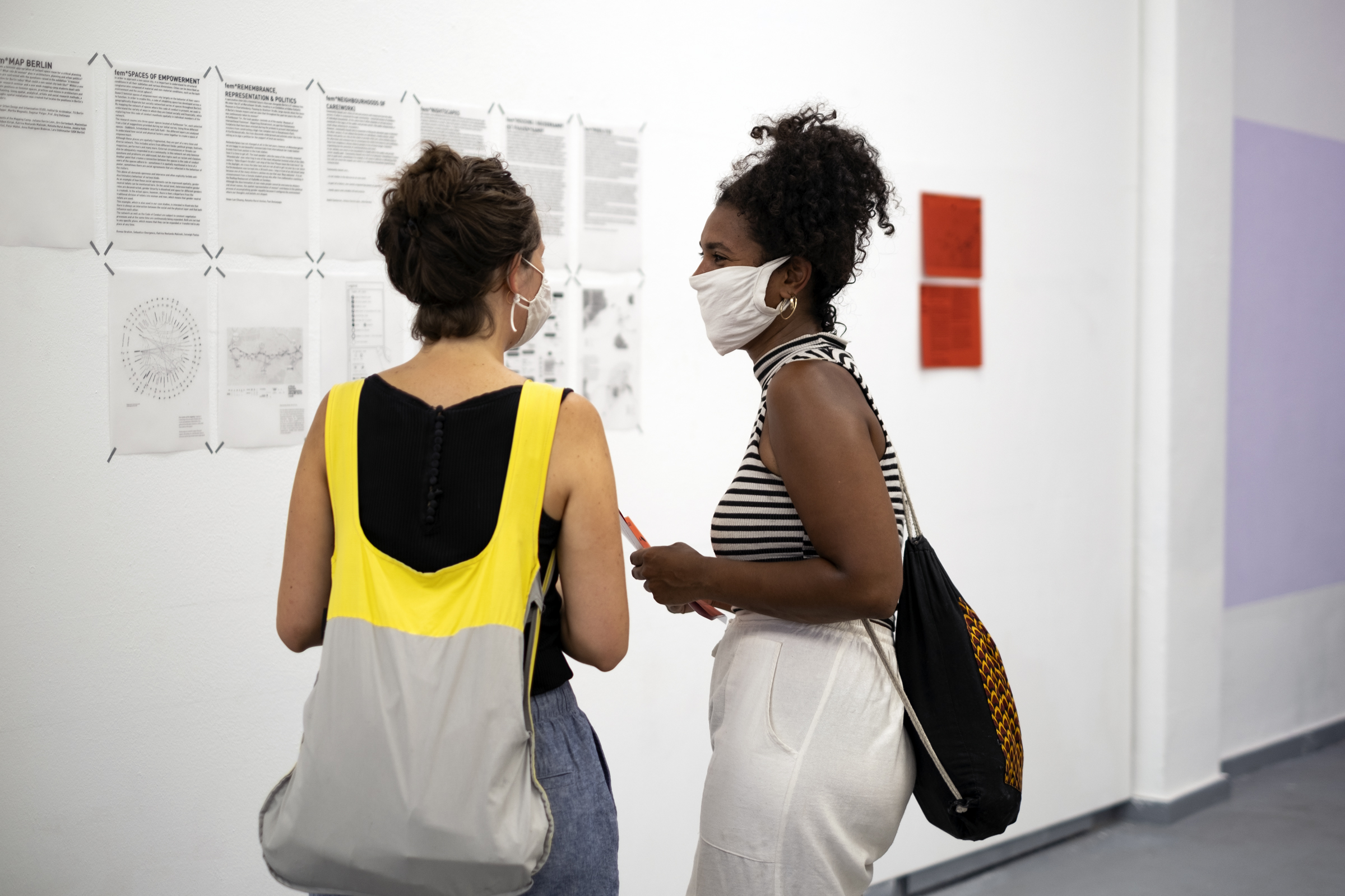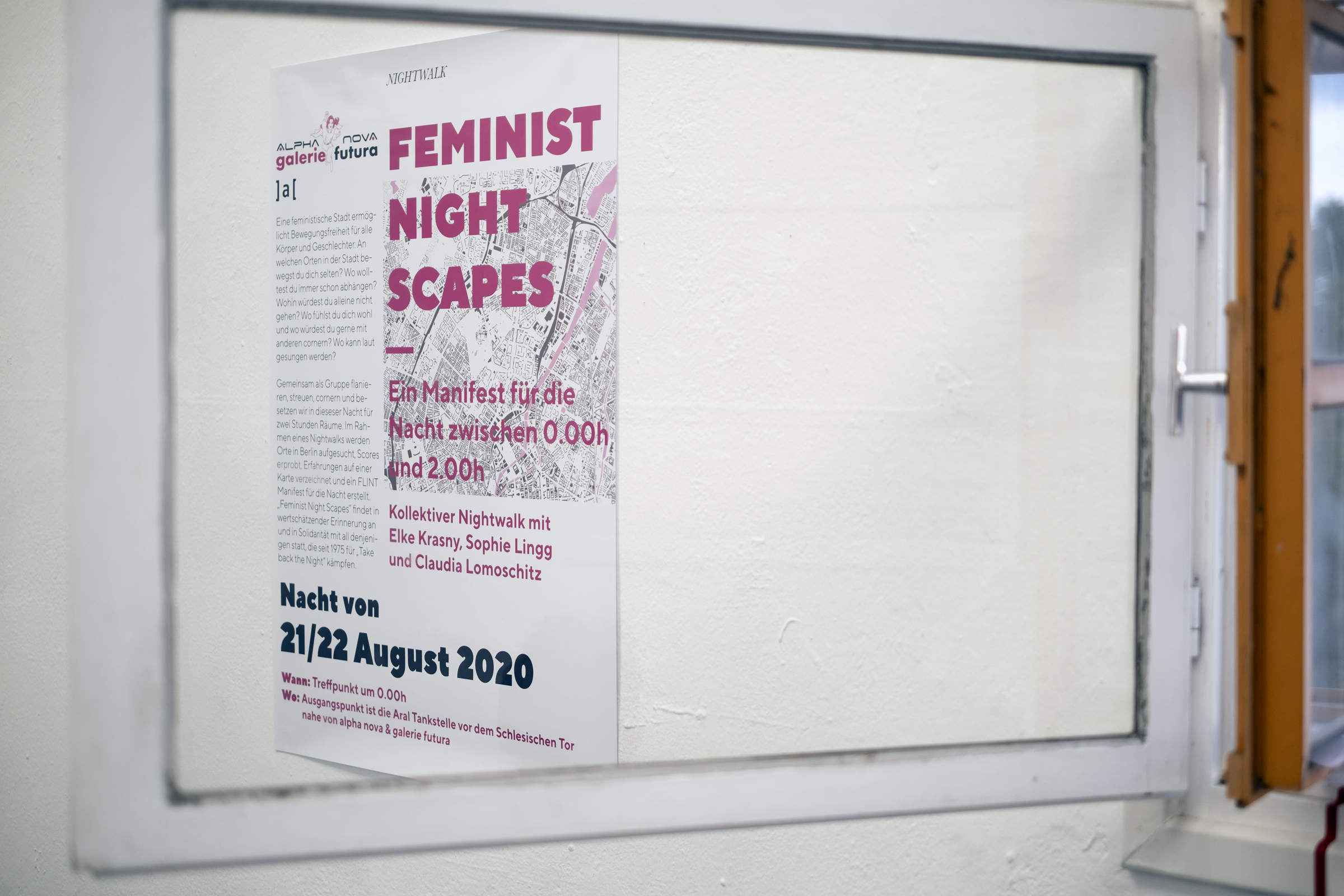 Die Ausstellung mit Positionen von Sarah Held, Elke Krasny & Sophie Lingg & Claudia Lomoschitz, Dorothea Nold, Banu Çiçek Tülü, Lena Wegmann und Ina Wudtke widmet sich in Installationen, Fotografien, Sound- und Textarbeiten Stadt- und Raumkonzeptionen aus einer feministischen Perspektive. Die Arbeiten thematisieren gegenwärtige urbane und gesellschaftliche Schieflagen und entwickeln stadtpolitische feministische Visionen für eine diskriminierungsfreie Zukunft. Anhand eines Mappings werden in Zusammenarbeit mit dem Chair for Urban Design and Urbanization des Instituts für Architektur der TU Berlin die Werke im Berliner Stadtraum verortet.